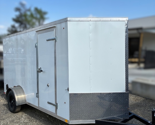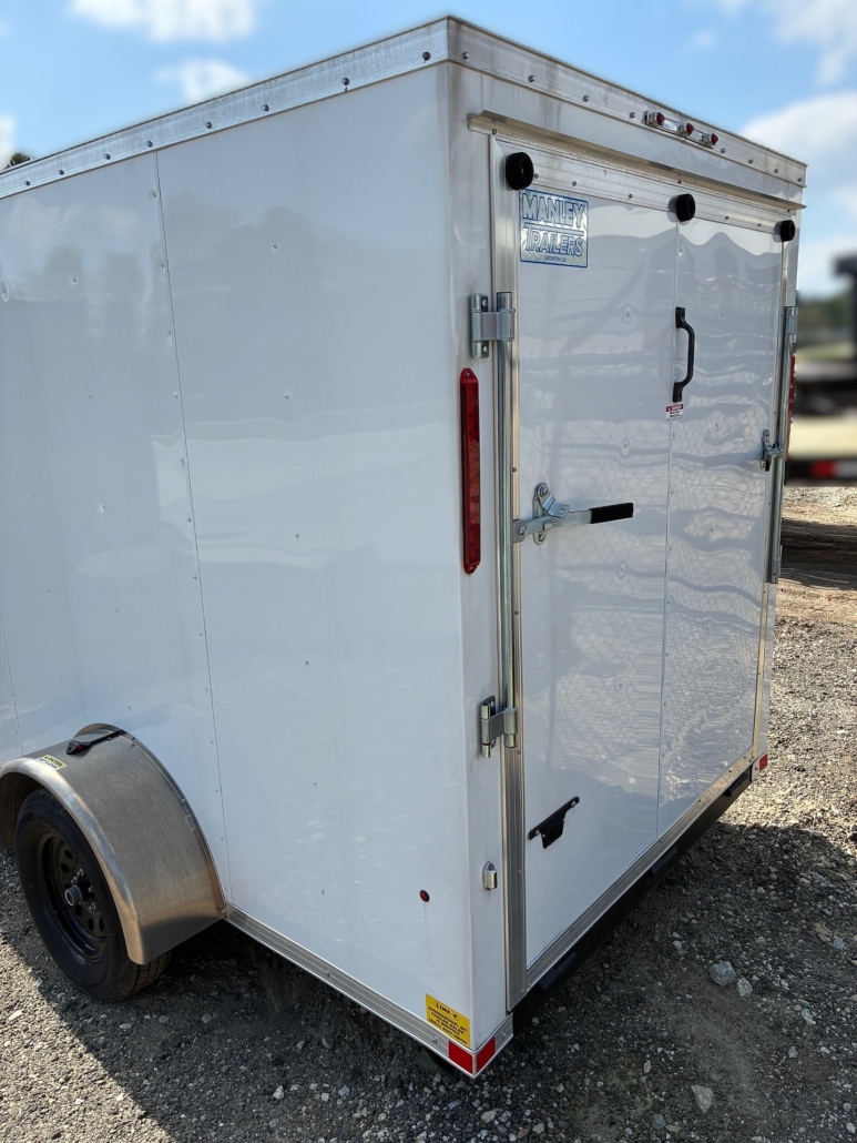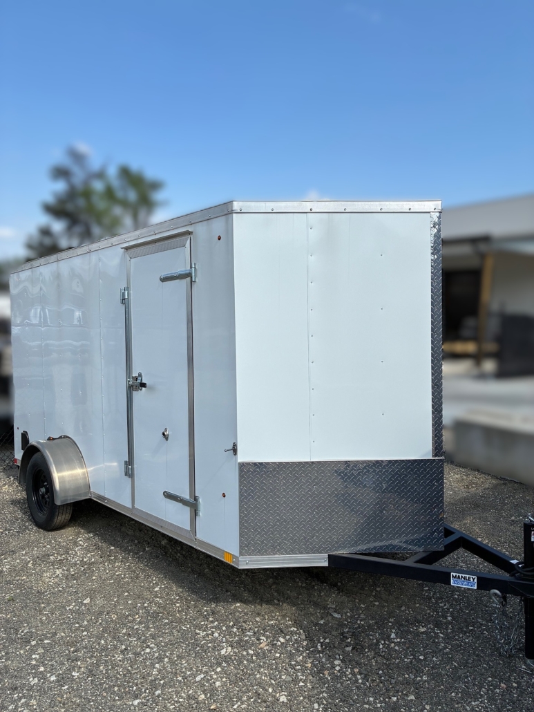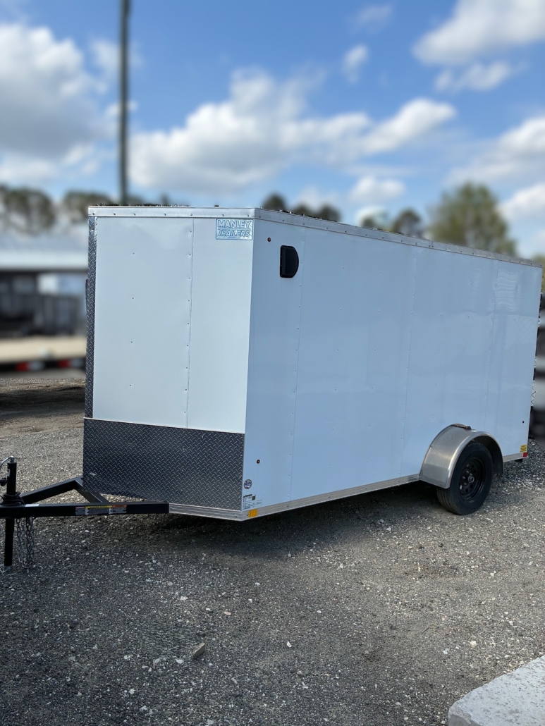 The 2025 Manley 6×12 enclosed trailer is a lightweight, single‑axle enclosed cargo trailer built with composite construction, a V‑front design, and a one‑piece roof for durability and efficiency. With a 3,500‑lb GVWR and 1,780‑lb payload capacity, it delivers practical hauling power in a compact, easy‑to‑tow white bumper‑pull package.
